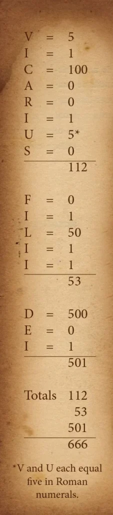 ஓ. அது 666 என்கிற மர்மமான எண்ணை பெற்றிருக்கும் (வெளி. 13:18):  “அது மனுஷனுடைய இலக்கமாயிருக்கிறது” என்று இந்த வசனம் கூற, “அதின் நாமத்தின் இலக்கத்திற்கும்” என்று வெளி. 15:2 கூறுகிறது.  போப்புமார்க்கம் என்று நினைத்ததும் யார் உங்கள் நினைவிற்கு வருகிறார்கள்? இயற்கையில் போப்புவைத்தான் நினைப்போம்.  அவருடைய அதிகாரப்பெயர் என்ன?  இங்கே ஒரு கத்தோலிக்க குறிப்பு இருக்கிறது.  கவனியுங்கள்: “ரோமிலிருக்கும் போப்புவினுடைய பெயர்:  “விகாரியஸ் ஃபிலி டை” (“தேவகுமாரனுடைய பிரதிநிதி”).6 :The Keys of This Blood” என்கிற தனது புத்தகத்தில் மலாக்கி மார்டின், பக்கங்கள் 114, 122 ல் போப்புவிற்கு இதே பெயரை உபயோகிக்கிறார்.  ஒரு ஆங்கில தொழிபெயர்ப்பு (அதன் கத்தோலிக்க பதிப்பில்) வெளிப்படுத்தல் 13:18ற்கான குறிப்பில்: “அவருடைய பெயரின் எண்ணிக்கை இந்த எண்ணில் இருக்கும்” என்று சொல்லுகிறது.