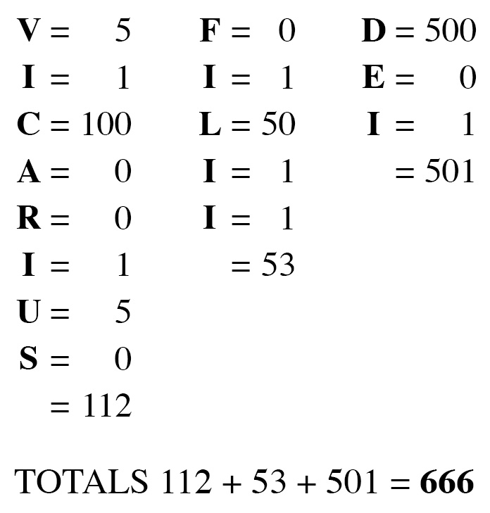NOTE: In Revelation 13:18, God says to count the number of the beast’s name and that it is the number of a man. When we think of the papacy, the man we naturally think of is the pope. What is his name? One of the pope’s official titles is “Vicar of the Son of God,” which is “Vicarious Filii Dei” in Latin (the official language of the church). Newspaper articles, when referring to the pope as “Vicar of Christ,” will often enclose the words in quotation marks to show that they are a translation of his title, or name. The book of Revelation is saying that the Roman numeral value of the letters of his name will equal 666. Let’s see whether or not Point 9 and 10 fit the papacy: